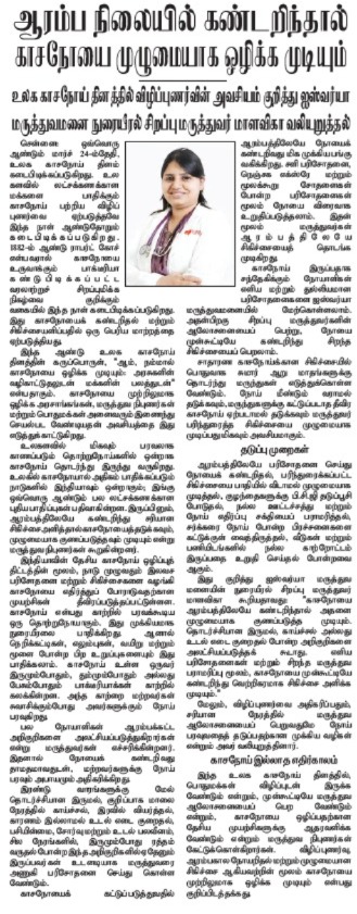 உலக காசநோய் தினத்தை முன்னிட்டு (மார்ச் 24), Dina Kural, Southern Mail, Maalai Yugam ஆகிய செய்தித்தாள்களில் ஐஸ்வர்யா மருத்துவமனை நுரையீரல் நிபுணர் டாக்டர் மாளவிகா அவர்கள் முக்கிய விழிப்புணர்வு கருத்துகளை பகிர்ந்துள்ளார்.