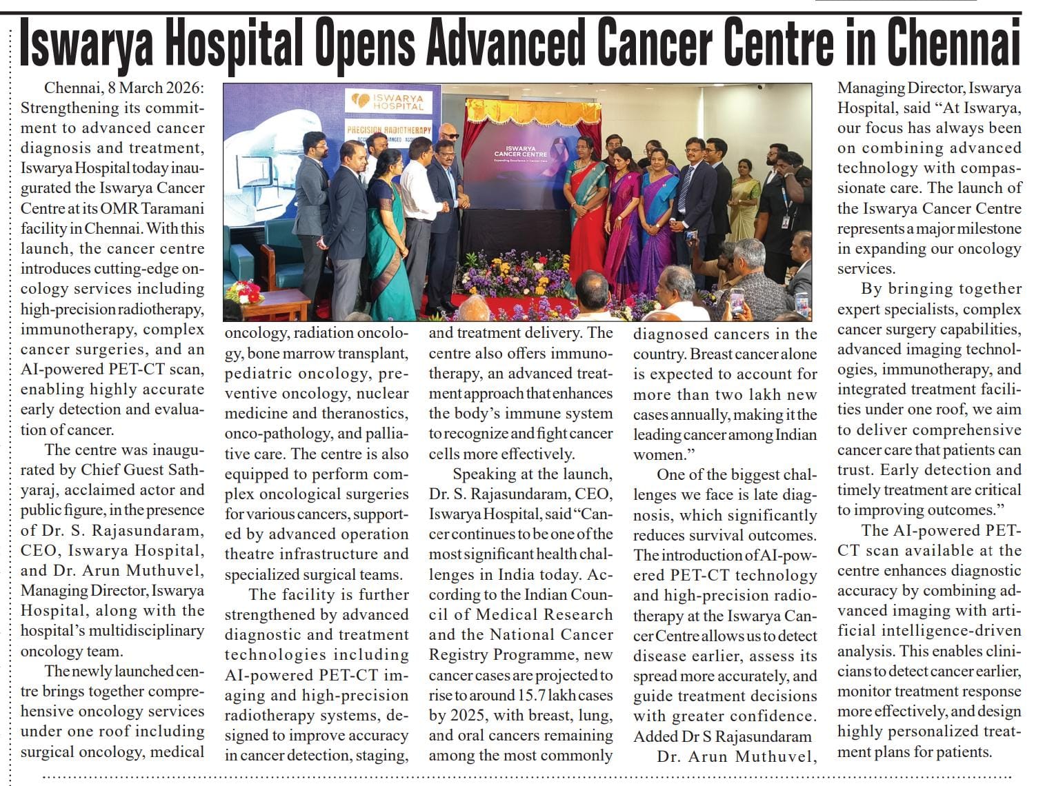 This initiative strengthens Iswarya Hospital’s mission of providing world-class healthcare and improving cancer outcomes for patients across Chennai and surrounding regions.