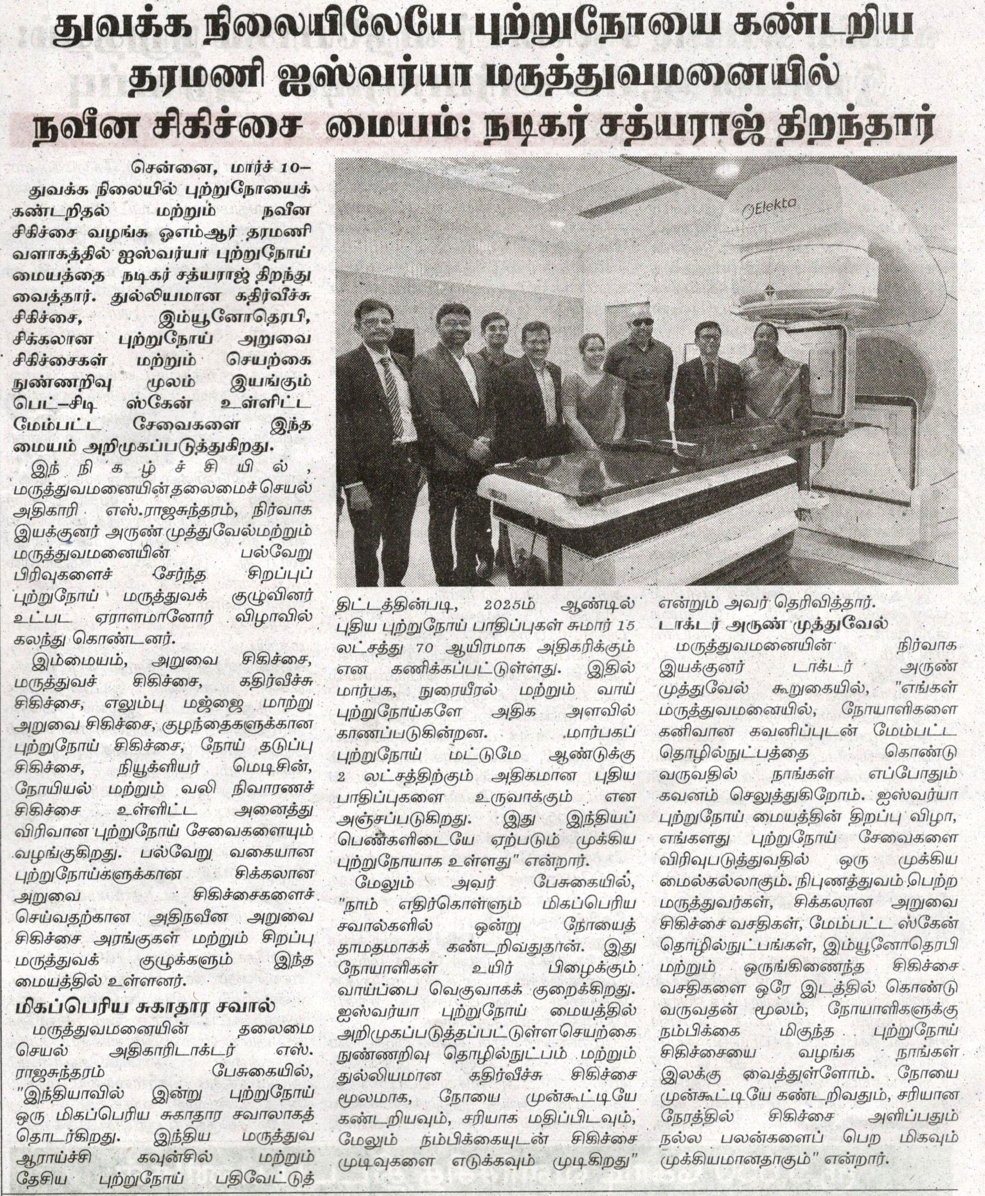 The cancer centre was inaugurated by renowned actor Sathyaraj, in the presence of Dr. S. Rajasundaram, CEO of Iswarya Hospital, Dr. Arun Muthuvel, Managing Director, and the hospital’s multidisciplinary oncology team.