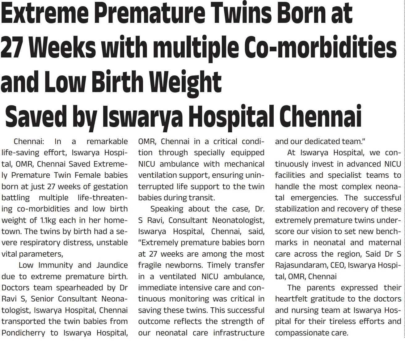 Iswarya Hospital successfully treated 27-week premature twins in its Advanced NICU, showcasing its capability in managing extremely fragile newborns.