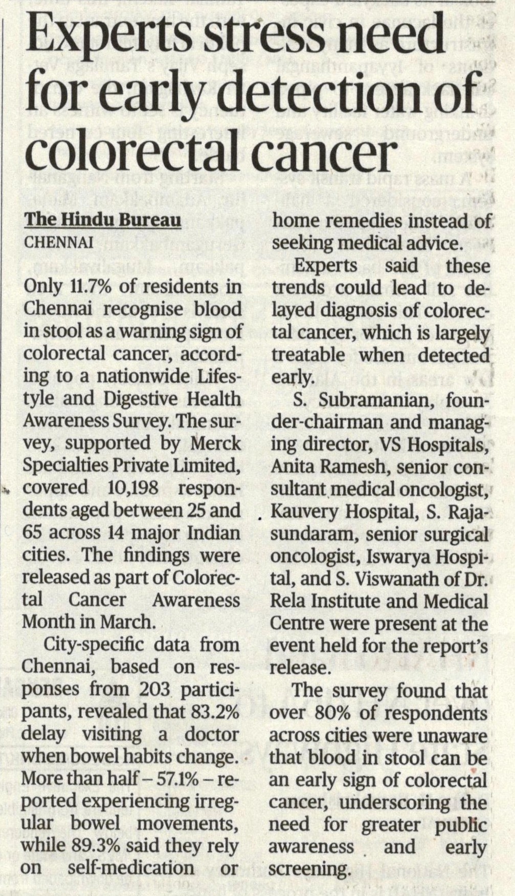 A recent article published in The Hindu (Chennai Edition) highlights a serious concern: awareness about colorectal cancer symptoms remains low, even in urban populations.